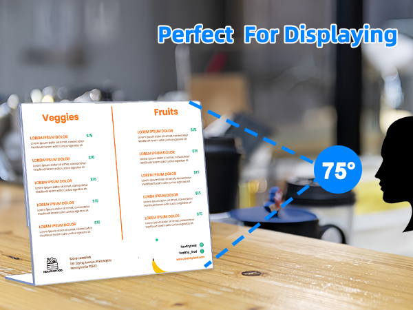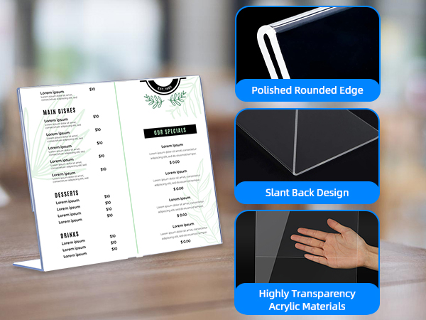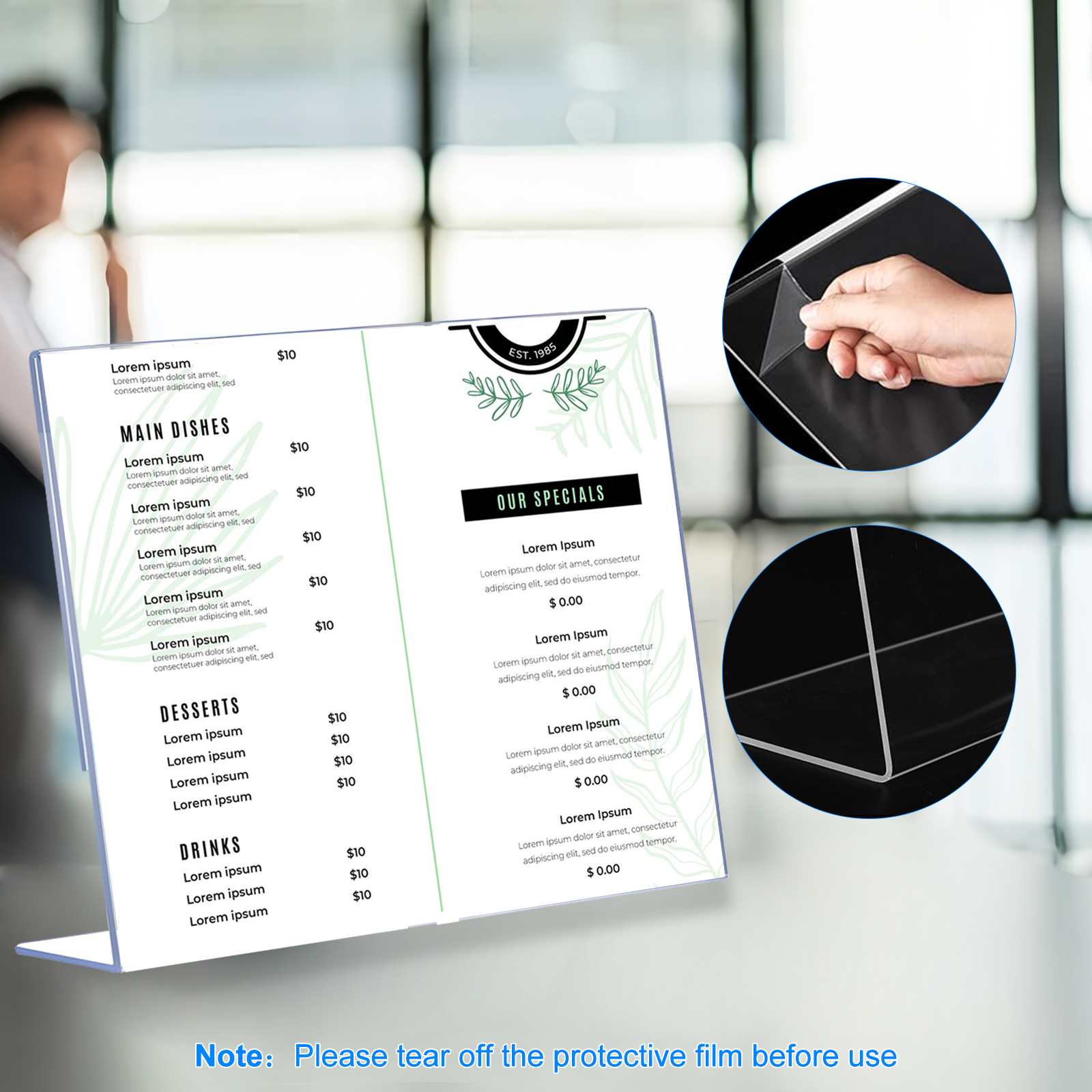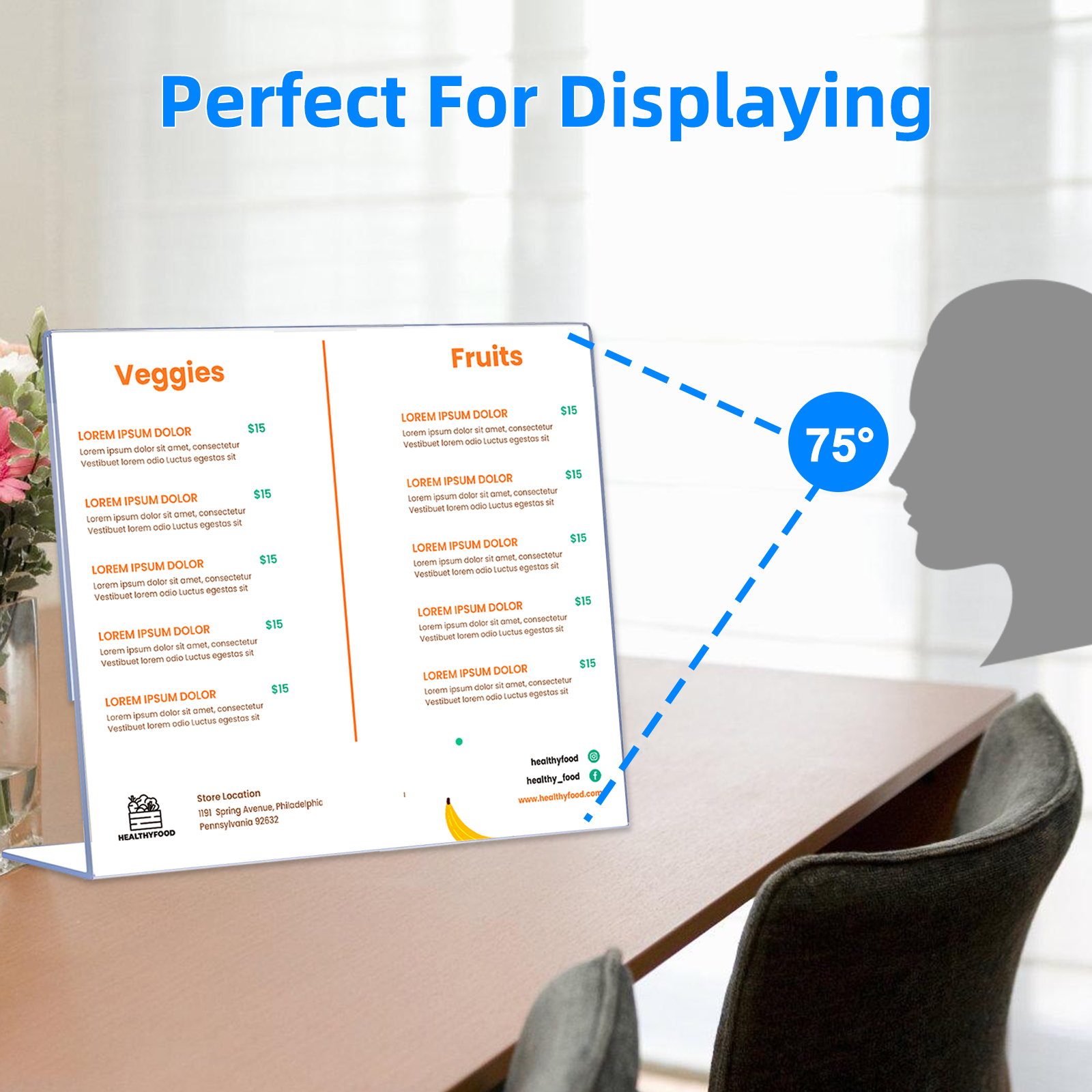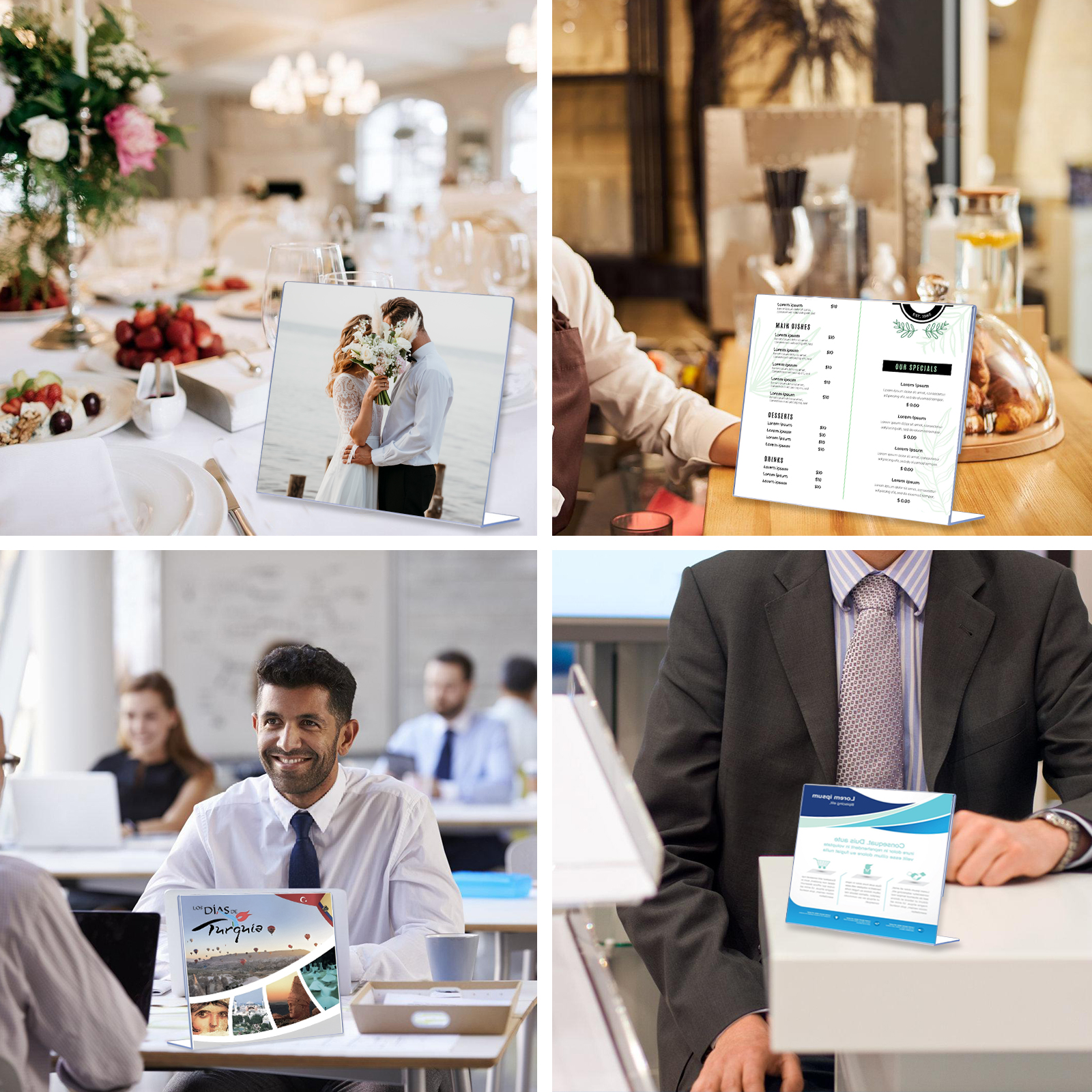 2. Clear Acrylic Stand for Table Versatile Self-Standing Design: Effortlessly display 11” x 8.5” signage on tabletops with the sturdy L-shape base—ideal for offices, restaurants, stores, or events. No assembly required!